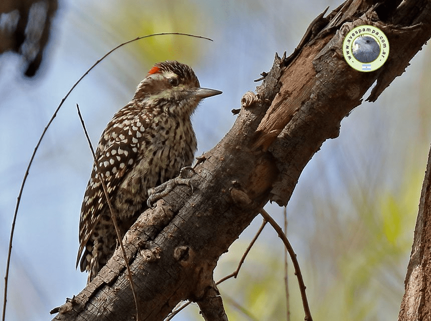 Su área de distribución rodea la zona pampeana, no obstante puede ser observado al NE de Bs. As. y sur de Entre Ríos. Trepa ramas. Corona estriada. Nuca roja en el macho dividida por línea negra. Nuca negra en la hembra. Dorso y alas maculado. Ventral estriado. Cola barrada en “V”.