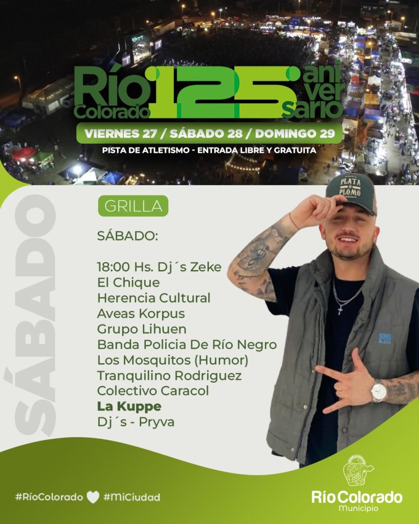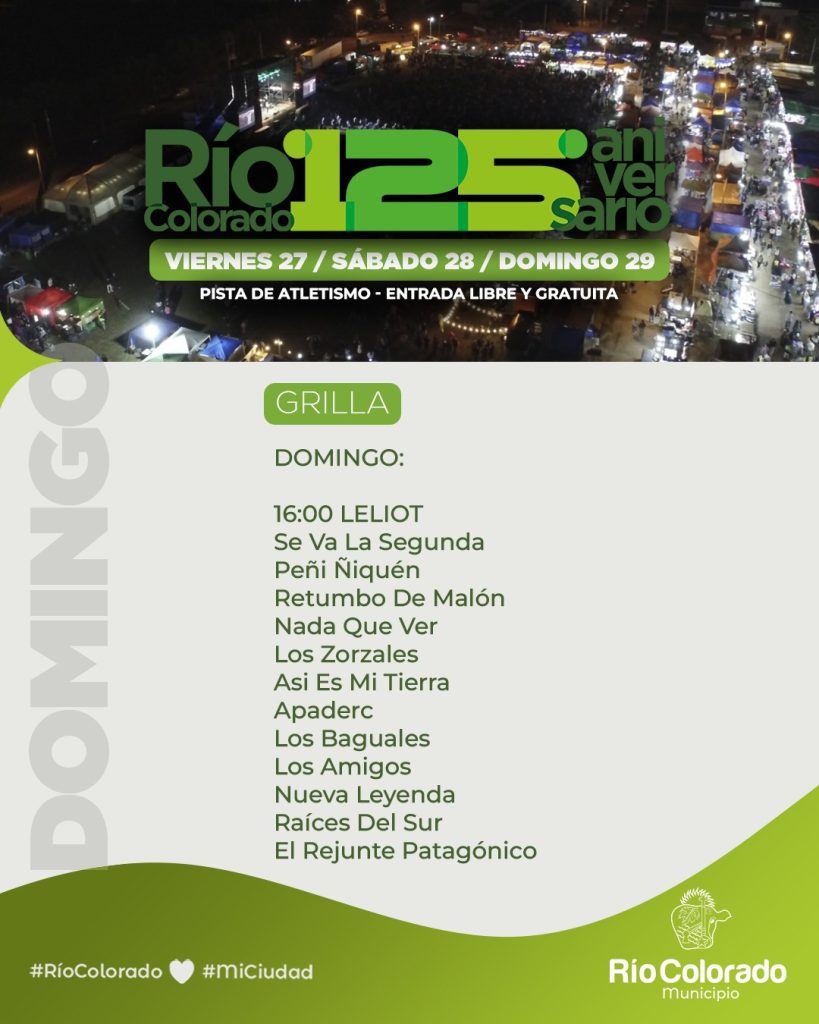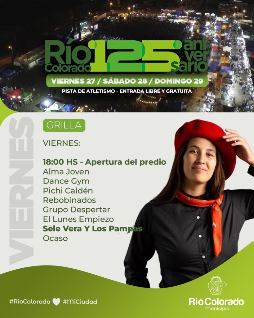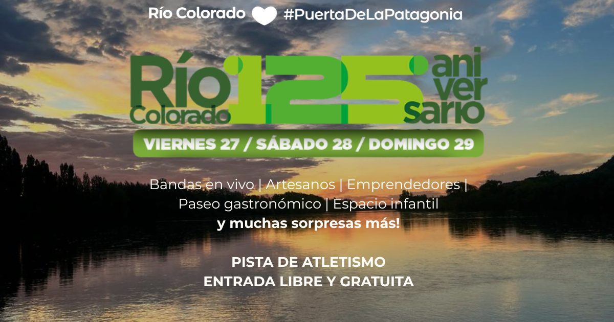 En el marco del 125° aniversario de Río Colorado, la ciudad se prepara para vivir un fin de semana cargado de propuestas para toda la familia, con espectáculos musicales, emprendedores, gastronomía, actividades deportivas y experiencias turísticas que invitan a disfrutar y redescubrir la localidad.